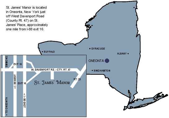 St. James' Manor Congregate Apartments and Duplex Houses are conveniently located in a beautiful wooded setting on West Davenport Road (County Rt. 47) just minutes from downtown Oneonta's shopping, restaurants, medical clinics and A.O. Fox Hospital.